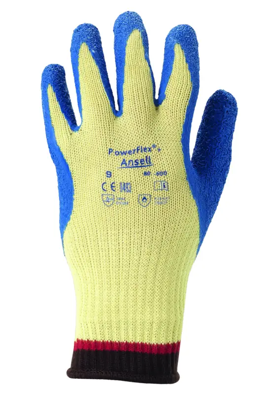 De handschoen met Kevlar voering en tricot manchet.is de praktische oplossing om op een veilige wijze glas, metaal en plastic te man ipuleren. Ze onderscheidt zich door een uitzonderlijke snijweerstand, uitstekende algemene mechanische prestaties en een superieur comfort. Zowel in natte als droge omstandigheden biedt deze handschoen een uitstekende greep dankzij de coating op de palm uit natuurrubber. De PowerFlex® 80-600 is een unieke handschoen die op een bijzonder efficiënte manier een goede bescherming met natuurlijke beweeglijkheid combineert. Geschikt voor glassector metaalindustrie. In overeenstemming met EN 420:2003+A1:2009; EN 388:2016: X.4.4.4.C; EN 407:2004: X.2.X.X.X.X.