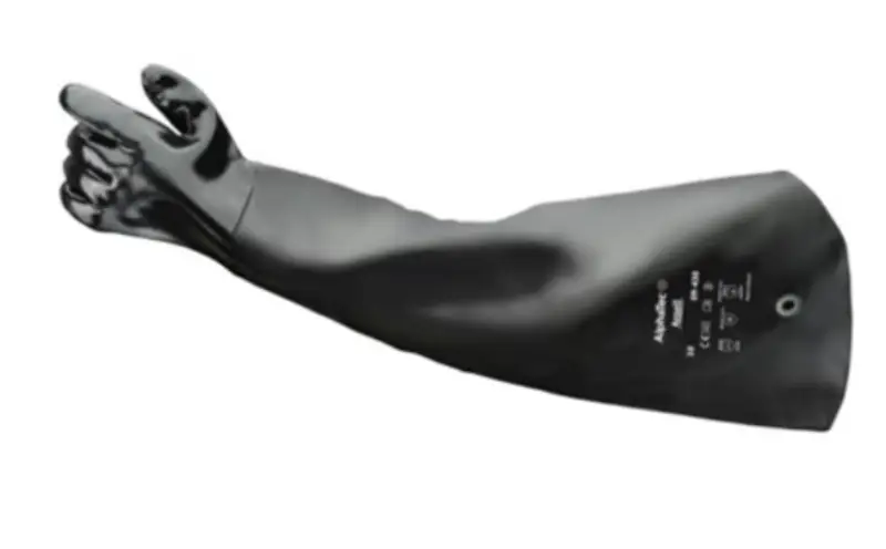 Lange vloeistofdichte handschoen in jersey met hoogwaardige neopreencoating. Biedt een hoge mechanische weerstand en is bestand tegen een brede waaier van chemische producten. Vandaar ook de grote vraag naar deze handschoen vanuit de chemische en petroleumindustrie, de transportsector en de bedrijven die met gevaarlijke stoffen werken. Latex- en siliconen vrij. Lengte 80 cm.