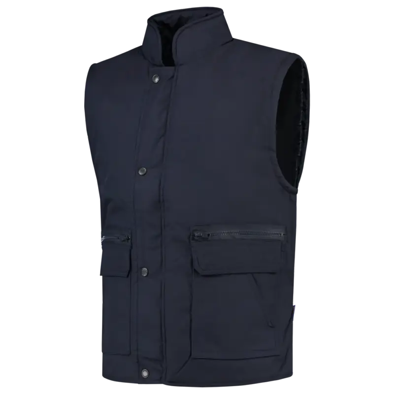 Deze bodywarmer heeft een traditionele pasvorm. Het verlengde rugpand zorgt ervoor dat ook tijden het bukken de rug bedekt blijft. De bodywarmer biedt voldoende opbergruimte met 6 zakken aan de voorzijde en 2 binnenzakken, waarvan 1 geschikt voor de telefoon. De bodywarmer wordt geopend met een printerrits. De armsgaten zijn voorzien van elastische windvangers. Kwaliteit: 65% polyester/35%katoen, Platbinding, 160 g/m². Beschikbare kleuren: Marine, zwart en wit. Beschikbare maten: XS-5XL.