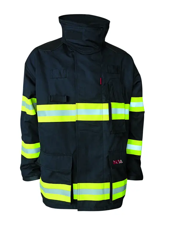 Brandweerjas in NOMEX® STRIKE, 220g/m², SOFIGUARD® met FR PU membraan( 145g/m²) en aramide voering (250g/m²). Hoge afzonderlijke kraag, opgezette radiozak en microfoonlus, ritssluiting onder flap met velcrosluiting, manchetten met duimlus, 2 opgezette zakken met flap en uitloopgaten, zaklamphouder, gecoate kevlar® verstevegingen op schouder en ellebogen, verlengd rugpand, onderzijde afgewerkt om opstijging van water tegen te gaan, extra inwendige thermische verstevegingen aan schouders en armen. Beschikbare kleur: Marine. Beschikbare maten: S-4XL.