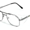 Grijze metalen veiligheidsbril in klassiek pilootdesign met polycarbonaat glazen ter bescherming tegen inslag en stof. Voorzien van een kraswerende laag en anti fog coating. Dubbele neusbrug voor extra stevigheid. Instelbare neussteuntjes en aanpasbare oorveren. De zijbescherming in helder polycarbonaat en vastgeklonken.