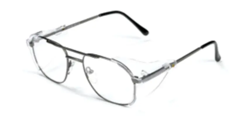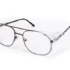Donkergrijze, metalen veiligheidsbril met polycarbonaat glazen ter bescherming tegen inslag en stof. Voorzien van een kraswerende laag en anti fog coating. De zijbescherming in helder polycarbonaat en vastgeklonken. Apart bijpassend etui verkrijgbaar.
