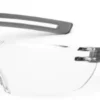 Grijze metalen veiligheidsbril met polycarbonaat glazen ter bescherming tegen inslag en stof. Voorzien van een kraswerende laag en anti fog coating. Instelbare neussteuntjes en aanpasbare oorveren. De zijbescherming in helder polycarbonaat en vastgeklonken.