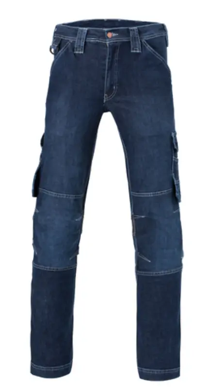 Jeans met verdekte ritssluiting, 2 ruime ingezette zijzakken, 2 ruime achterzakken waarvan 1 met klep, loshangende duimstokzak met GSM-zakje, ruime loshangende dijbeenzak met klep en extra toolzakjes, drievoudig gestikte naden op kwetsbare plekken voor een extra lange levensduur, voorgevormde broekspijpen voor zeer goede pasvorm, brede riemlussen, verstelbare hamerlus d.m.v. drukknoop, zeer sterk ademend stretch doek (polyamide/Lycra) in de knieholte voor optimaal draagcomfort, 1 D-ring voor badgehouder, reflecterende piping. Kwaliteit: 66%/30%/3%/1% gerecycled katoen/katoen/polyester/Lycra, 407 gr/m2. Beschikbare maten: 29-34. Beschikbare kleuren: Marine.