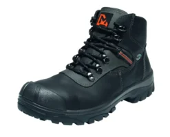 Hoge chemische resistente en waterdichte veiligheidsschoen in gecoat leder. Voorzien van stalen neus en antiperforatiezool, gepolsterde watertong. Gevoerd met Sympatex membraan Airflow tegen transpiratie. Lederen binnenzool en buitenzool in rubber en polyurethaan, olie-, benzine- en zuurbestendig, antistatisch en antislip. Maten: 37-49, Breedte: XD. Kleur: zwart/grijs.