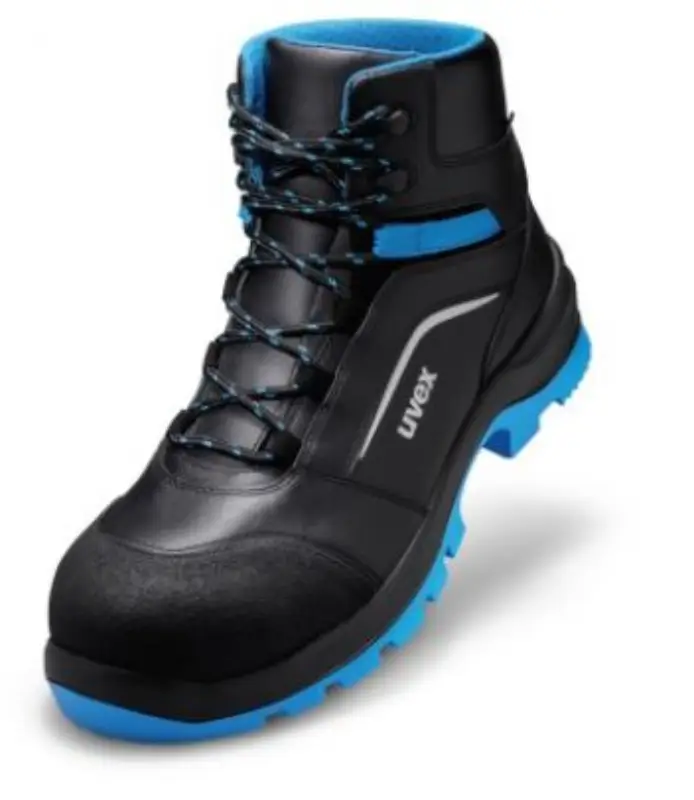Hoge metaalvrije veiligheidsschoen S3 in zwart waterbestendig rundsleder met kunststof Duo Component 200J neus, overneus. Voorzien van een ademende voering in textiel. Gepolsterde tong en uitneembare, antistatische inlegzool, vochtabsorberend. Zool in PUR (PU/PU): soepel en lichtgewicht, olie- en benzinebestendig, antislip. ESD: electrostatic discharge. Maten: 38-52 (10, 11, 12).
