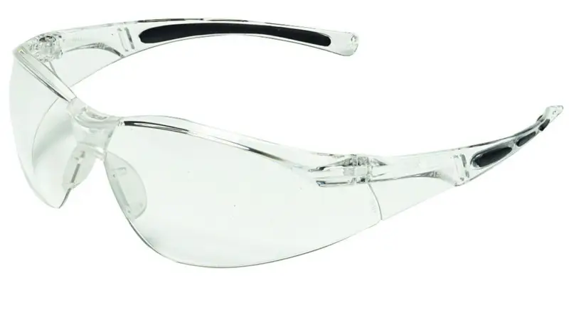 Veiligheidsbril A800 met ruim gezichtsveld en lenzen in blank polycarbonaat, behandeld met een anti-damp coating. Voorzien van een z achte neusbrug met antislip effect.