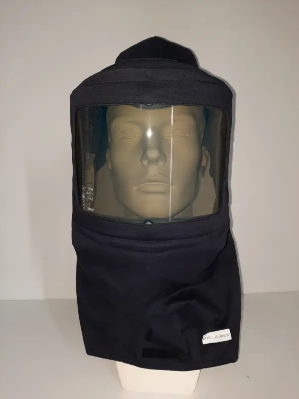 Gelaatsbeschermkap tegen vlambogen voor de elektromonteur met doorlopende flap. Volgens PBM-regelgeving 2016/425 en overeenkomstig DIN + EN-normen (met name DIN EN 166 -170 en GS-ET 29, klasse 2 (7kA 0,5s) en klasse 2++ (10kA 0,5s), Lichtdoorlatendheid ~ 48% = klasse 2). Vlamboogklasse: 2++. Met ATPV-label 35 cal/cm² Materiaal kap: Dubbellaags S451 Indura Ultrasoft 325g/m². Dimensies scherm: 250 x 165 mm.