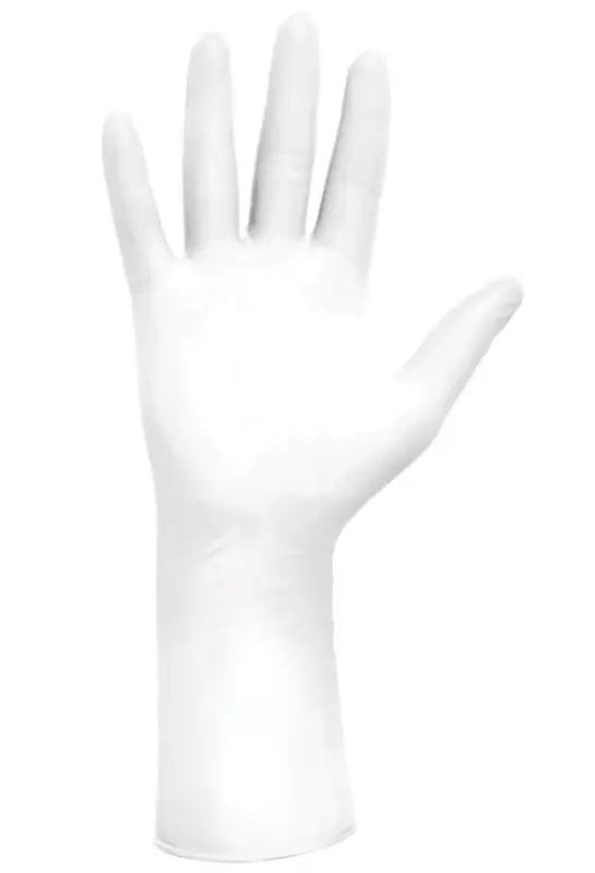 Witte nitril handschoen voor eenmalig gebruik geschikt voor cleanroom classe ISO 3 of hoger. Poedervrij, latexvrij, siliconen vrij, en vrij van versnellers. Ambidexter, met geruwde vingertoppen. Maten: XS-XL.