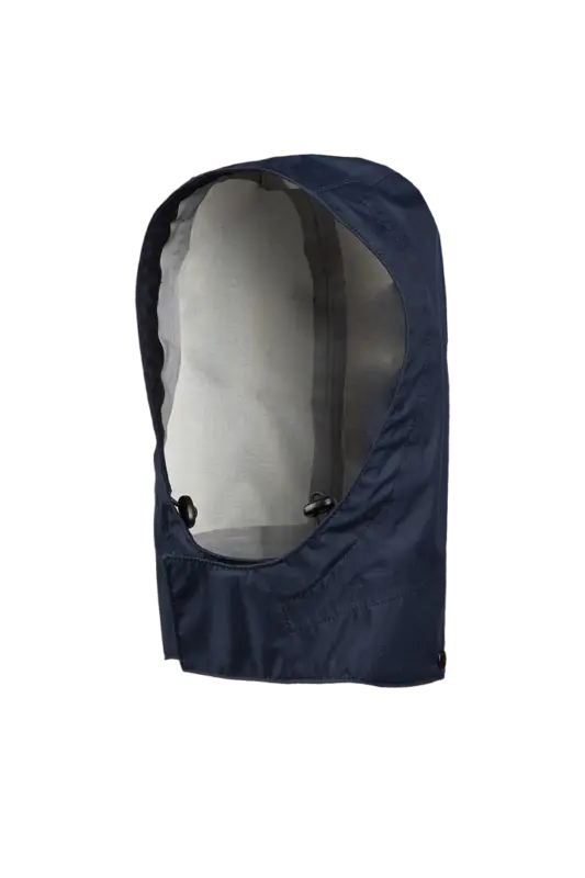 Afneembare boogkap met kinbescherming en klep. Kwaliteit: FR PU + inherent FR breien; ± 280 g / m² Beschikbare maten: XS-3XL. Beschikbare kleuren: Navy. In lijn met: IEC 61482-2: 2018 klasse 1 – ATPV 9.1 cal / cm², EN ISO 11612: 2015 / A1 A2 B1 C1 E1 F1, EN ISO 11611: 2015 / Klasse 1 – A1 A2, EN 1149-5: 2018 , EN 13034: 2005 + A1: 2009 Type PB [6] en EN 343: 2019 / Klasse 4-4-X.