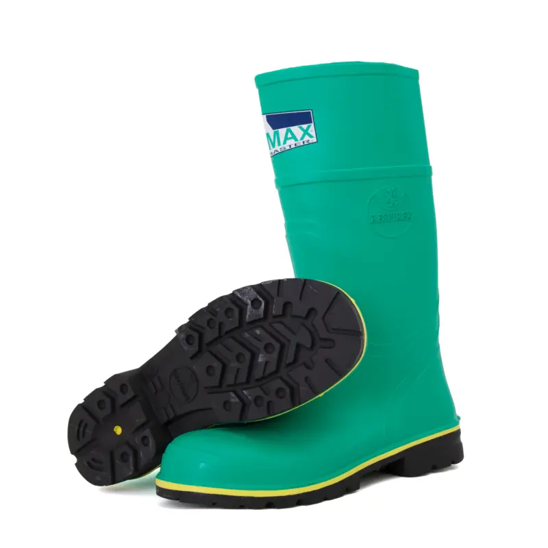 De HAZMAX S5 HRO ESD laars, opgebouwd uit groen, chemisch bestendig HAZMAX met naadloze constructie, bevat een 200J stalen neus en antiperforatiezool in roestvrij staal, met een nog sterkere snijbestendigheid dan traditionele veiligheidslaarzen. De laars kan ook aangepast worden in hoogte. Voering uit geweven nylon. Sterke chemische bestendigheid tegen chemische dampen en stoffen. De gevulkaniseerde en slipbestendige buitenzool in nitril is bestand tegen contacthitte tot 300°C, benzine, oliën en heeft een koude-isolerende functie. De inlegzool is comfortabel, uitneembaar en wasbaar tot 40°C. Maten: 35 – 50.