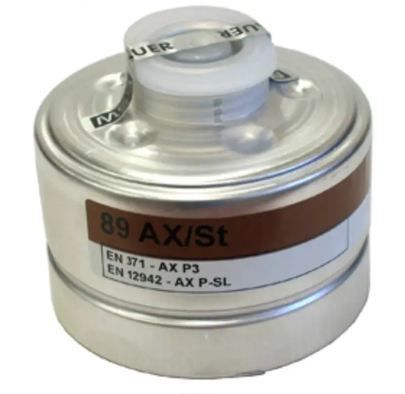 AXP3 schroeffilter DIN 148 in aluminium behuizing. Beschermt tegen organische gassen & dampen met kookpunt lager dan 65°C, toxische stof-, nevel- en rookdeeltjes. Te combineren met volmasker met standaard schroefdraad. Filter slechts 1 maal te gebruiken. Filter van klasse 2: tot max concentratie van 0,5 %.
