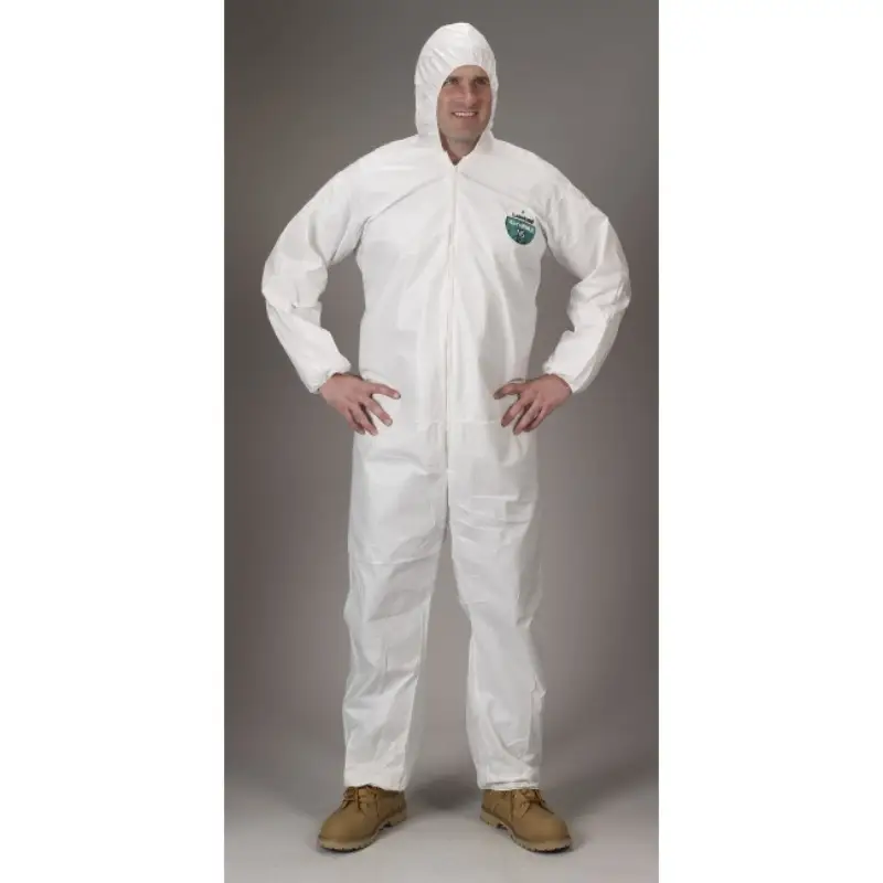 Overall, 65 gr/m², microporeuze film laminaat, lichtgewicht, kap, elastische taille polsen en enkels, 3 draads overlock steek.