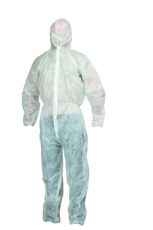 Overall, polypropyleen/polyethyleen met vloeistofdichte coating,elastiek aan polsen en enkels, elastiek in de taille, ritssluiting, kap.Beschikbaar in: wit. Maten: L – XXL.