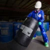 Splashpak bleu laminate. Pak met vaste chemisch bestendige handschoenen Kemblok. De broekspijpen zijn voorzien van vaste sokken en van rechte pijpen als laarsovertrek. De rits bevindt zich aan de achterkant van het pak. Het persluchtapparaat dient onder het pak gedragen te worden. Beschikbaar in: blauw. Maten: S – XXL.