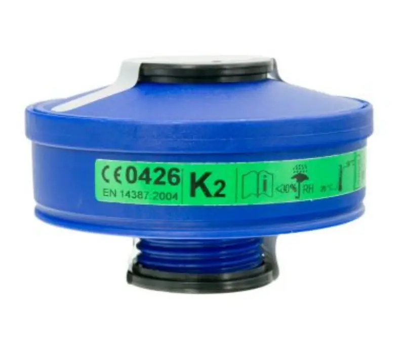 Beschermt tegen ammoniak en organische ammoniakdampen. Te combineren met half-of volgelaatsmasker met standaardschroefdraad aansluiting. Filter klasse 2 tot max concentratie van 0,5%. Gewicht: 175gr.