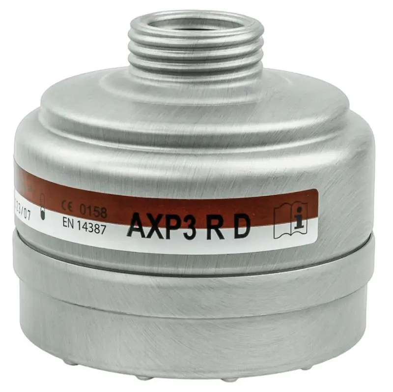 AXP3 schroeffilter DIN 148 in aluminium behuizing. Beschermt tegen organische gassen & dampen met kookpunt lager dan 65°C, toxische stof-, nevel- en rookdeeltjes. Te combineren met volmasker met standaard schroefdraad. Filter slechts 1 maal te gebruiken. Filter van klasse 2: tot max concentratie van 0,5 %.