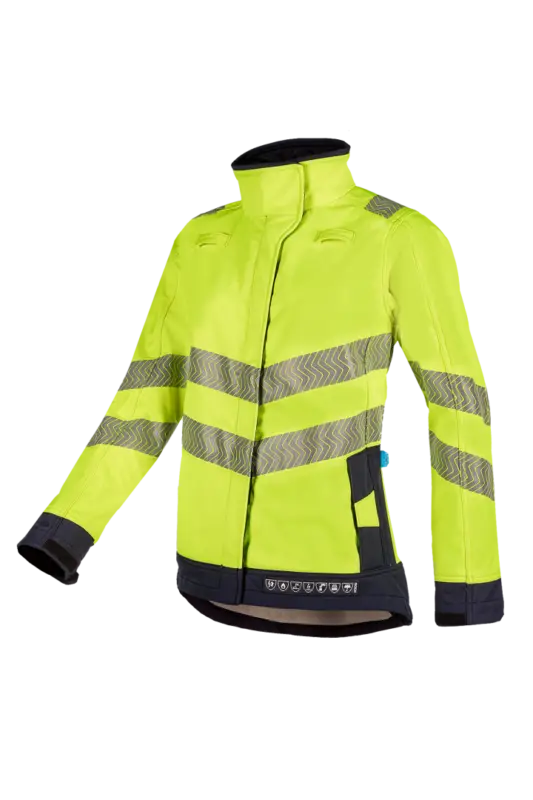 Multinorm softshell dames Heika met vlamboogbescherming: Rechte kraag; Ritssluiting onder klep; 2 ingezette zakken; 2 lussen voor gasdetectoren; Ronde mouwen; Mouwvernauwing; Verlengde achterstaart; Vlamvertragende reflecterende gesegmenteerde striping (50 mm). Samenstelling: 3-laags softshell: polyesterweefsel + ademend FR PU + inherent FR-fleece + AST; ± 350 g/m². Beschikbare maten: XS-2XL. Beschikbare kleuren: Fluo oranje/navy en fluo geel/marine. Voldoet aan: IEC 61482-2: 2018 APC1 – ATPV 24,3 cal/cm², EN ISO 11612: 2015 / A1 B1 C2 F1, EN ISO 14116: 2015 / IND.3, EN ISO 11611: 2015 / Klasse 2 – A1 , EN 1149-5 : 2018, EN 13034 : 2005 + A1 : 2009 Type PB [6], EN ISO 20471 : 2013 +A1 2016 / Klasse 2 en EN 14058 : 2017 / Klasse 1 3 x x.