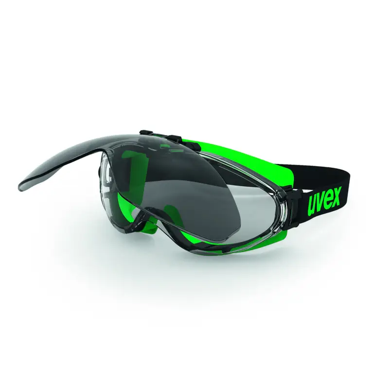 Lasgoggle met blanke lens en Supravision HC-AF coating (extreem krasbestendig aan de buitenzijde en voorkomt aandampen aan de binnen zijde. 100% UV-bestendig). Flip-uplens in grijs polycarbonaat met Infradur AF coating (biedt bescherming tegen schadelijke UV- en IR-straling bij lassen zonder daarbij kleuren te vervormen dankzij de grijze lens (EN 172). Met antidamp coating aan de binnenzijde en extreem krasbestendig aan de buitenzijde.).